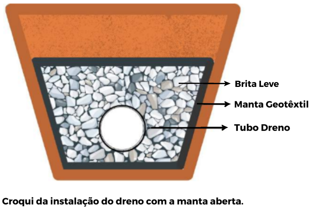 Fazer a base com cerca de 10 cm de brita, colocar o tubo dreno, e em seguida dispor de outra camada de brita até cobrir o tubo. Cobrir a vala com as sobras da manta fazendo o envelopamento e finalizar com a terra natural retirada da vala. (Figura abaixo).