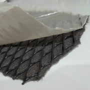 Geocomposto 2L é constituído por 1 geotêxtil Bidim e um núcleo de georrede em PEAD e uma lona plástica.