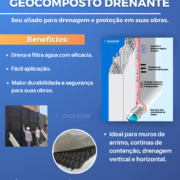 Onde aplicar: O GEOCOMPOSTO DRENANTE é indicado para aplicação em muros de arrimo, cortinas de contenção, drenagem de líquidos e drenagem de gases.