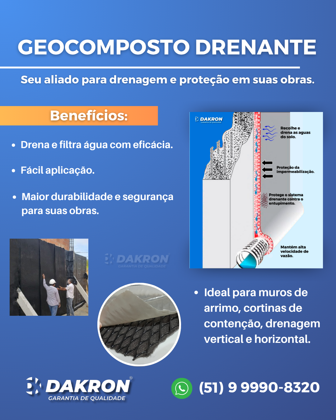 Proteção Mecânica: O núcleo de tela PEAD e a face de filme impermeável fornecem uma proteção mecânica robusta, garantindo a durabilidade do produto e a proteção das estruturas onde é aplicado.