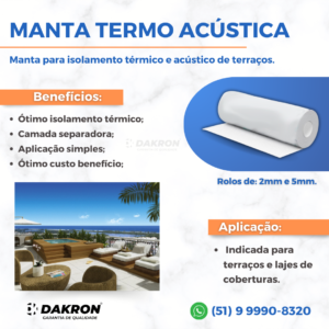 A MANTA ACÚSTICA de PEBD (polietileno expandido de baixa densidade) é produzida em material 100% reciclável e a sua aplicação é simples, não sendo necessária mão de obra especializada. A manta acústica é um produto desenvolvido com materiais leves, Fabricadas com polietileno expandido garantindo um maior conforto. As características de sua matéria-prima fazem com que apresente alta resistência à compressão, garantindo performance e segurança do piso a longo prazo.